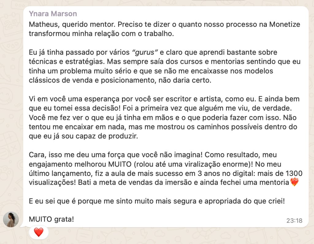Em 2024, aos 35 anos, lancei a Mentoria Monetize, um programa individual e personalizado para ajudar artistas e profissionais criativos a monetizarem o seu conhecimento. Nessa altura da vida, eu já não estava nem aí para o que os outros iam pensar. “Guru?”. Tanto faz. Se tem um assunto que tenho propriedade para falar, acho que é esse.